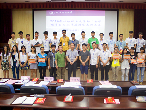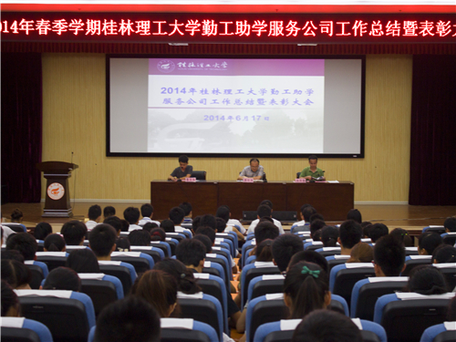 6月17日晚19:30,2014年春季学期桂林理工大学勤工助学服务公司总结暨表彰会在雁山校区图书馆报告厅召开。学生工作部(处)部(处)长唐壮东老师出席会议,勤工助学办公室主任农庆能老师、慕宗良老师、勤工助学管理委员会干部及公司全体在岗学生参加了会议。会议由慕宗良老师主持。