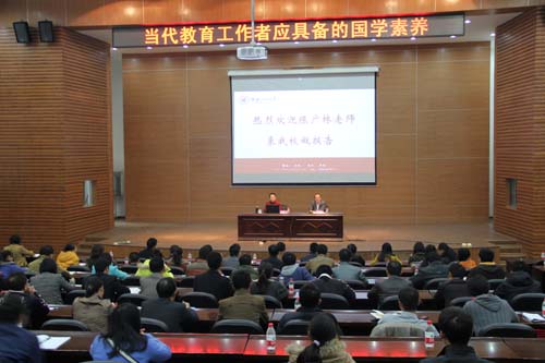 12月5日下午,广西师范大学文学院党委副书记、国学专家陈广林老师为我校2013年辅导员、班主任培训班作题为“当代教育工作者应具备的国学素养”精彩报告。学校党委副书记、纪委书记陈贵英与全体辅导员、2013级班主任一同聆听报告会。