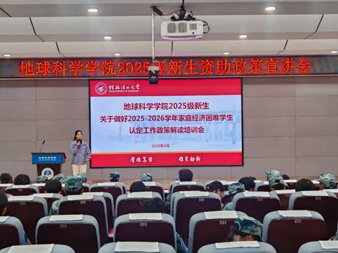 为使2025级新生全面了解资助政策,确保每一位学子无忧入学、安心求学,9月25日晚,地球科学学院在雁山校区01501报告厅成功举办了2025级新生资助政策宣讲会。本次宣讲会由学院负责资助工作的辅导员周密老师主讲,面向全体新生,系统解读以“奖、贷、助、勤、补、免”为主的多元资助体系。