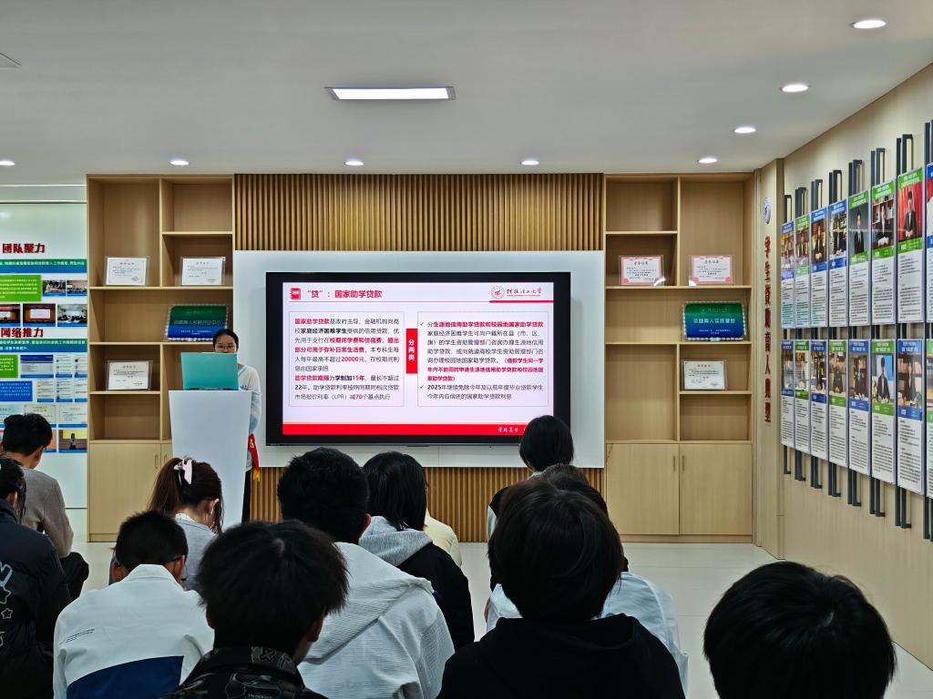 活动伊始,学校学生资助宣传大使陆鹏飞对学校资助育人实践基地的功能和作用进行了全面介绍,为同学们搭建了一个全面了解资助政策的平台。随后,何灿丽、韦砚俊、杨兰雨等3位同学对国家和学校的各项资助政策进行了深入解读,内容涵盖奖学金、助学金、国家助学贷款、勤工助学、参军入伍及基层就业学费补偿贷款代偿、学费减免等多种形式的内容,为大家答疑解惑。