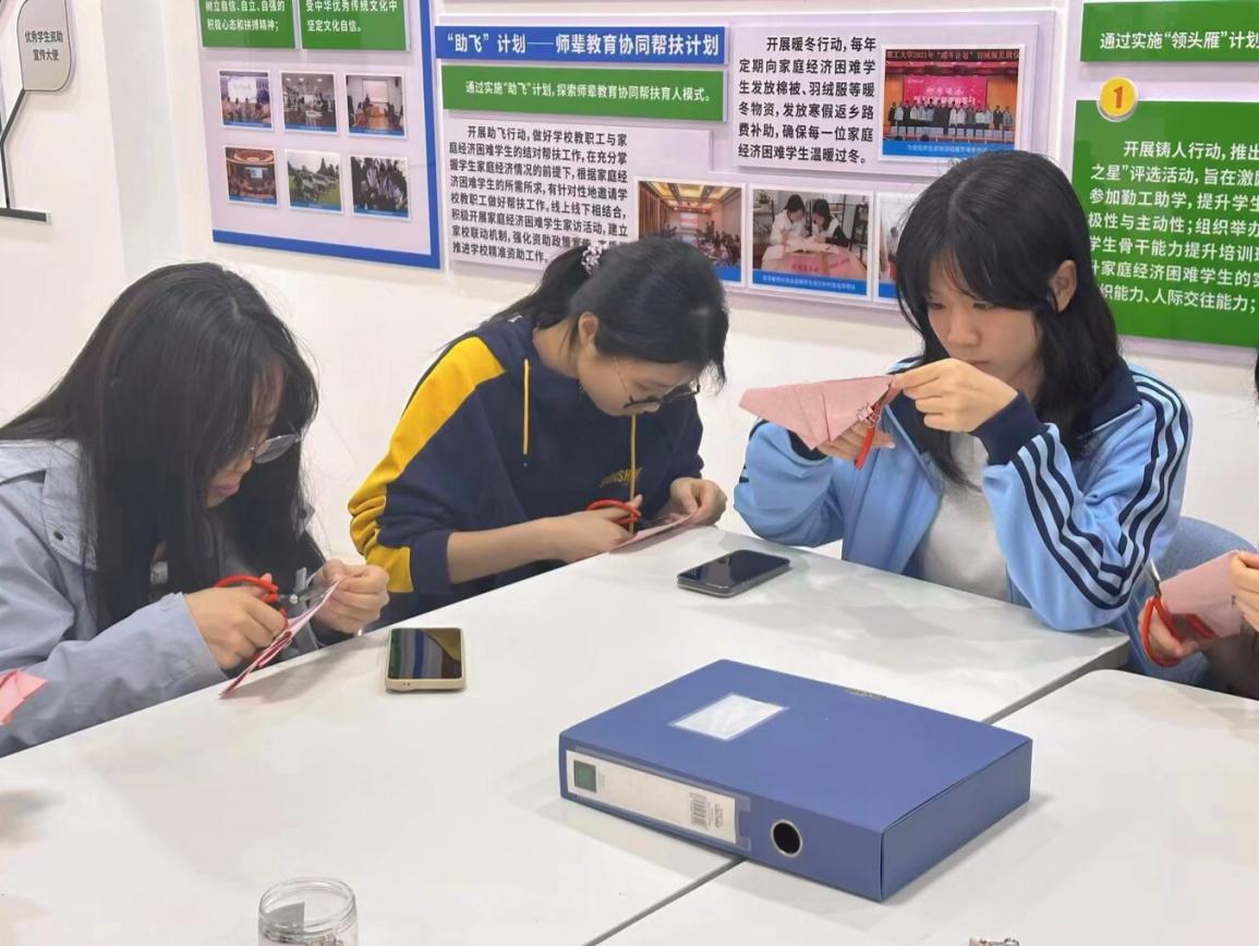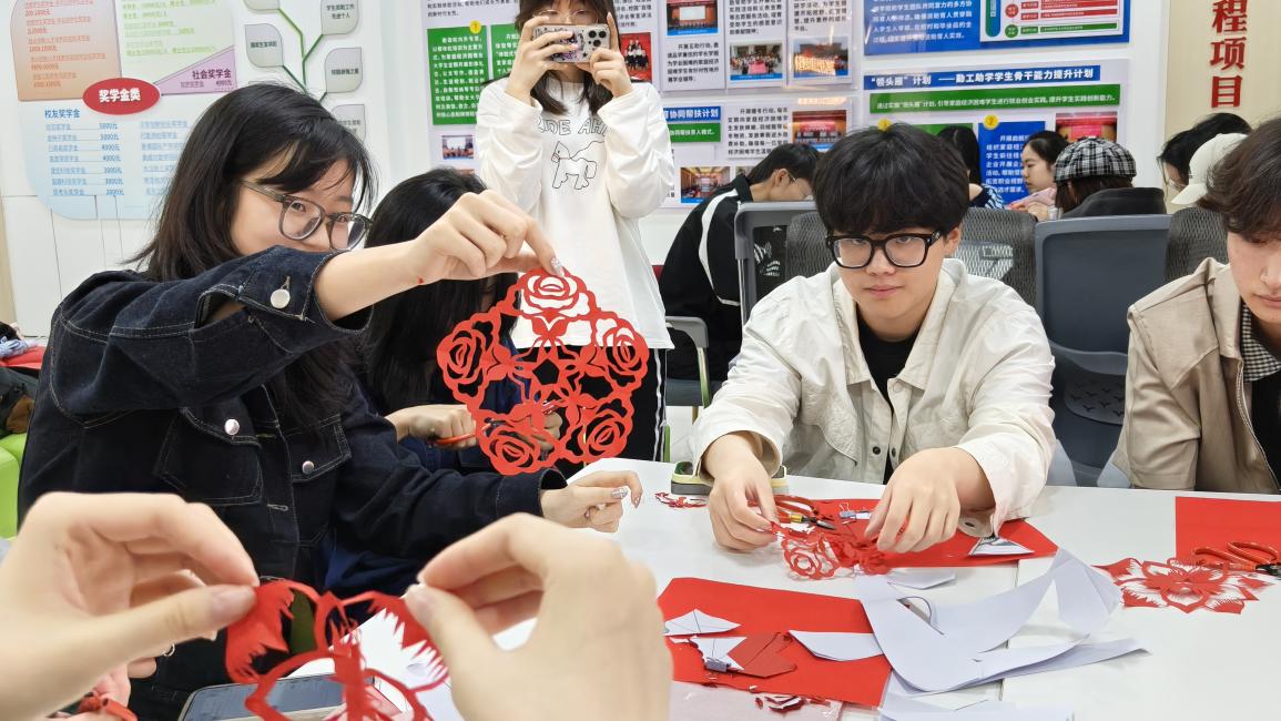 现场没有枯燥的说教,只有满室的红纸与欢声笑语。第一次剪出完整团花的同学难掩兴奋,迫不及待地与身边人分享喜悦,剪刀开合之间,普通的红纸被赋予了新的生命力,一幅幅蕴含巧思的团花作品在同学们手中陆续诞生,每一幅都凝聚着创作者独到的心意与匠心。