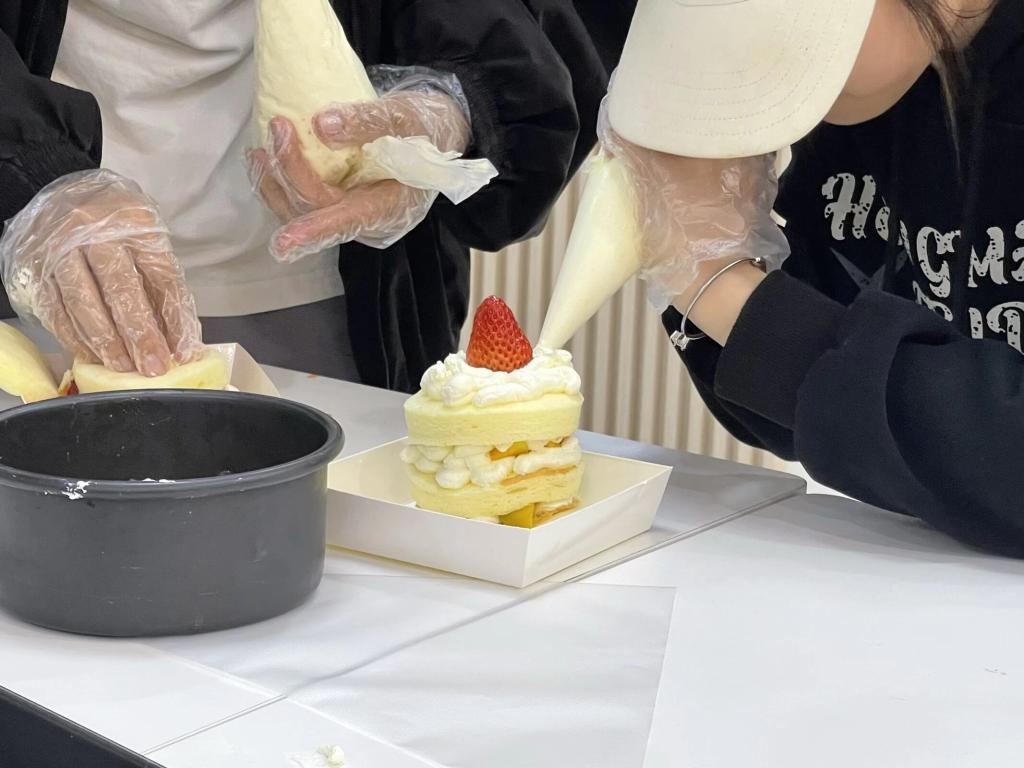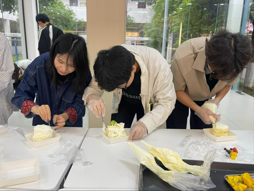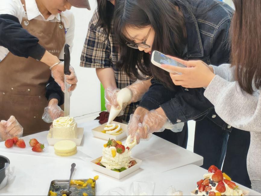 活动现场暖意融融,香气四溢。专业烘焙老师首先向同学们详细讲解了蛋糕制作的基本流程、食材配比和操作技巧,从蛋糕胚的烘烤到奶油的打发,从裱花的手法到装饰的创意,每一个环节都进行了耐心细致的示范。在老师的指导下,同学们纷纷戴上手套、拿起工具,兴致勃勃地开始了自己的创作。大家分工协作、互相配合,有的打发奶油,有的涂抹蛋糕胚,有的精心设计裱花图案,将自己的巧思与心意融入一块块香甜的蛋糕中。