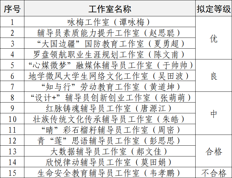 为进一步提升我校辅导员工作室建设水平,学生工作部(处)开展了2025年“辅导员工作室培优计划”立项项目验收考核工作。经工作室自评和学校复评,现将考核结果予以公示: