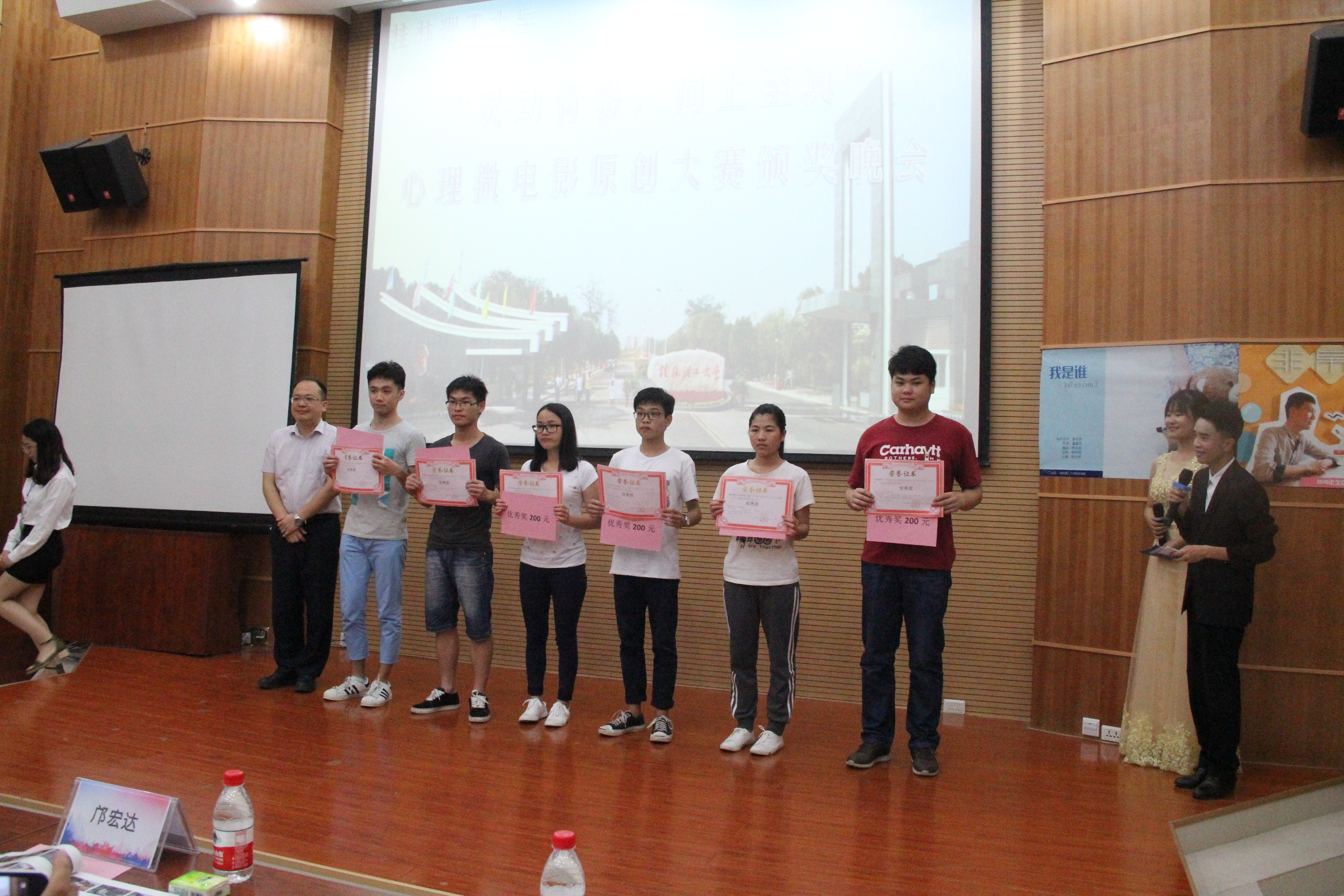 伴着广播电台富有感情的朗诵和精彩的开场宣传片,晚会拉开帷幕。随后,主持人上台介绍本次颁奖晚会的概况和到场嘉宾,并邀请唐壮东老师上台致词。接着,进行展播优秀作品代表《青春向未来》并邀请嘉宾老师宣读优秀奖作品和颁发荣誉证书,紧接着现场观众互动环节派发精美礼品让现场气氛活跃起来达到了第一个小高潮。在现场互动环节结束后,颁奖典礼再次回到主题。现场先后展播精选代表作品《成长心路》、《非常完美》、《我是谁》,并邀请嘉宾老师宣读一、二、三等奖和颁发奖项。其中,由最佳女主曾思琪带来歌曲《price tag》让全场气氛达到了第二个高潮。在此之后,本次晚会的第三大高潮:优秀指导老师奖、最佳导演奖、最佳编剧奖、最佳男、女主角奖、最佳摄影奖、最佳剪辑奖等奖项依次被颁发。最后,在观众热烈的掌声中,迎来了此次颁奖晚会的尾声。本次心理微电影原创大赛颁奖晚会就此拉下帷幕。