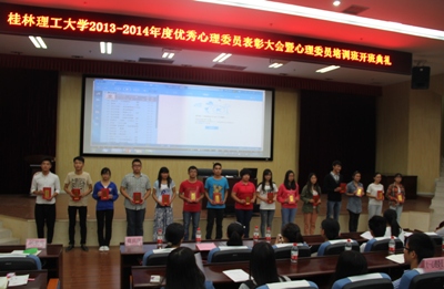 10月17日晚19:30,桂林理工大学2013-2014年度优秀班级心理委员表彰大会暨2014年秋季学期班级心理委员培训班开班典礼在雁山校区图书馆报告厅准时开始。大会由校心理健康教育与咨询中心主任谭咏梅主持,校团委副书记白凌婷、材料科学与工程学院学工组组长孙巍及各学院负责心理健康教育的辅导员出席了大会。